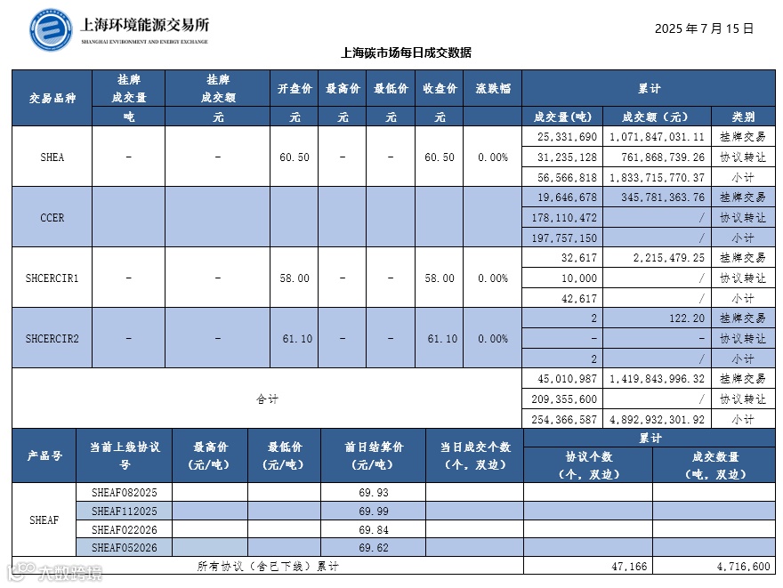 截止今日,上海碳市场所有现货品种累计成交量254,366,587吨,累计成交金额4,892,932,301.92元。其中,配额累计成交56,566,818吨,成交金额1,833,715,770.37元;CCER累计成交197,757,150吨;SHCERCIR1累计成交42,617吨;SHCERCIR2累计成交2吨。上海碳配额远期产品累计成交数量4,716,600吨。