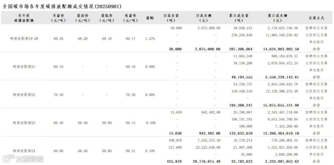 截至2025年9月1日,全国碳市场碳排放配额累计成交量696,136,159吨,累计成交额47,859,219,917.99元。