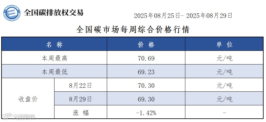 本周全国碳市场综合价格行情为:最高价70.69元/吨,最低价69.23元/吨,收盘价较上周五下跌1.42%。