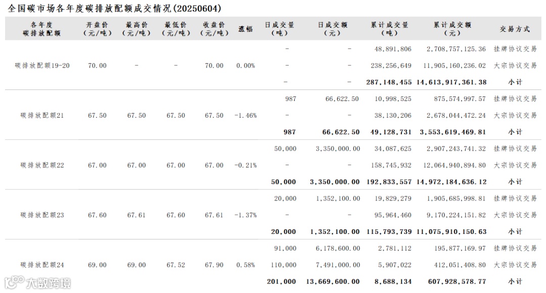 2025年1月1日至6月4日,全国碳市场碳排放配额成交量23,323,952吨,成交额1,790,833,093.20元。