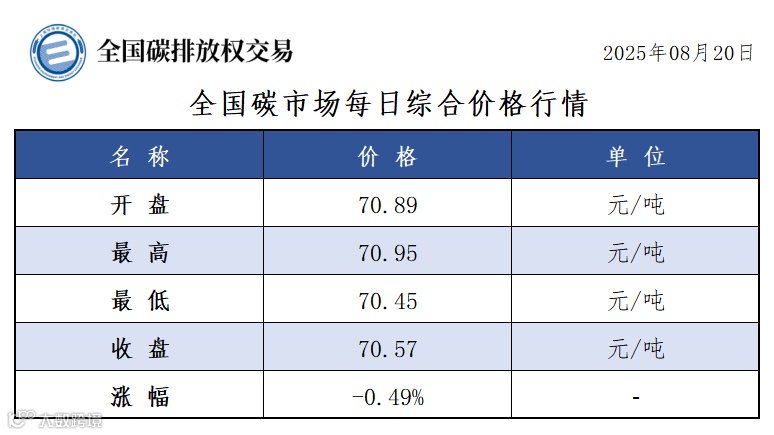今日全国碳市场综合价格行情为: 开盘价70.89元/吨,最高价70.95元/吨,最低价70.45元/吨,收盘价70.57元/吨,收盘价较前一日下跌0.49%。