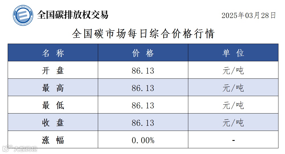 今日全国碳市场综合价格行情为: 开盘价86.13元/吨,最高价86.13元/吨,最低价86.13元/吨,收盘价86.13元/吨,收盘价与前一日持平。