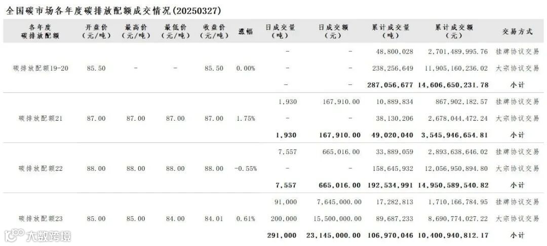 截至2025年3月27日,全国碳市场碳排放配额累计成交量635,581,754吨,累计成交额43,504,127,239.58元。