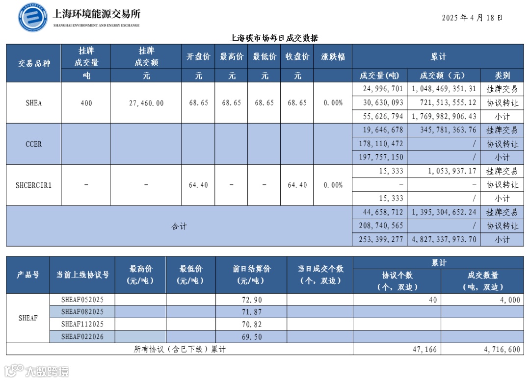截止今日,上海碳市场所有现货品种累计成交量253,399,277吨,累计成交金额4,827,337,973.70元。其中,配额累计成交55,626,794吨,成交金额1,769,982,906.43元;CCER累计成交197,757,150吨;SHCERCIR1累计成交15,333吨。上海碳配额远期产品累计成交数量4,716,600吨。