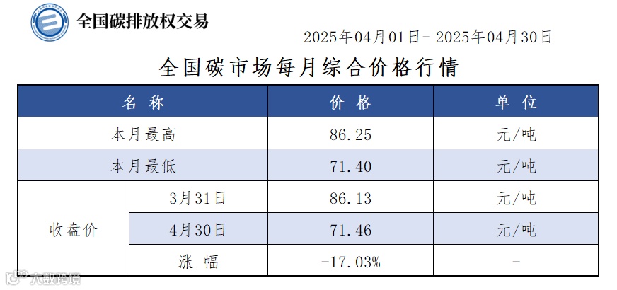 本月全国碳市场综合价格行情为:最高价86.25元/吨,最低价71.40元/吨,收盘价较上月最后一个交易日下跌17.03%。