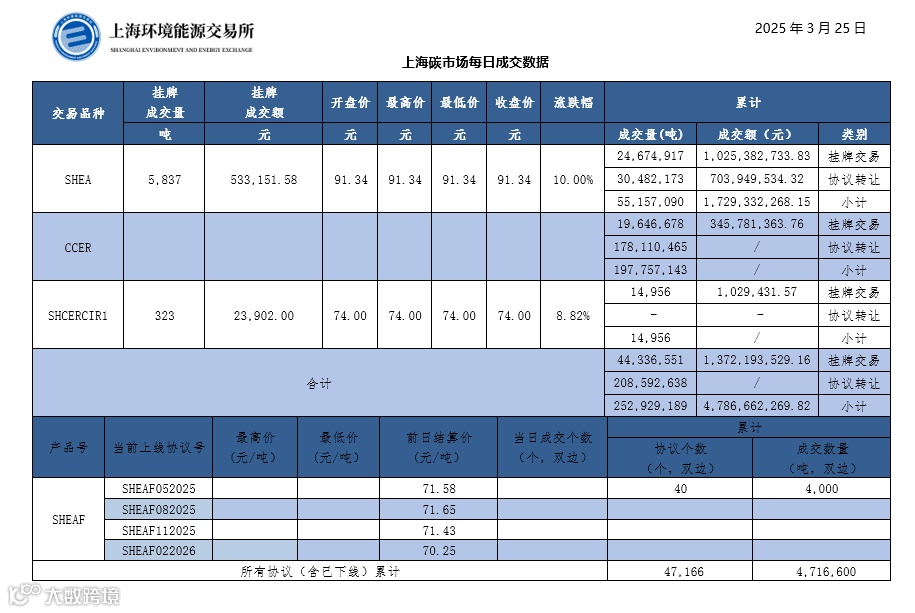截止今日,上海碳市场所有现货品种累计成交量252,929,189吨,累计成交金额4,786,662,269.82元。其中,配额累计成交55,157,090吨,成交金额1,729,332,268.15元;CCER累计成交197,757,143吨;SHCERCIR1累计成交14,956吨。上海碳配额远期产品累计成交数量4,716,600吨。