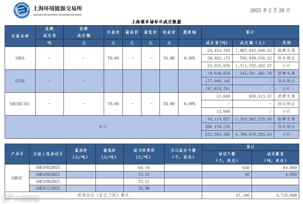【上海碳市场行情】上海碳市场每日成交数据20250220
