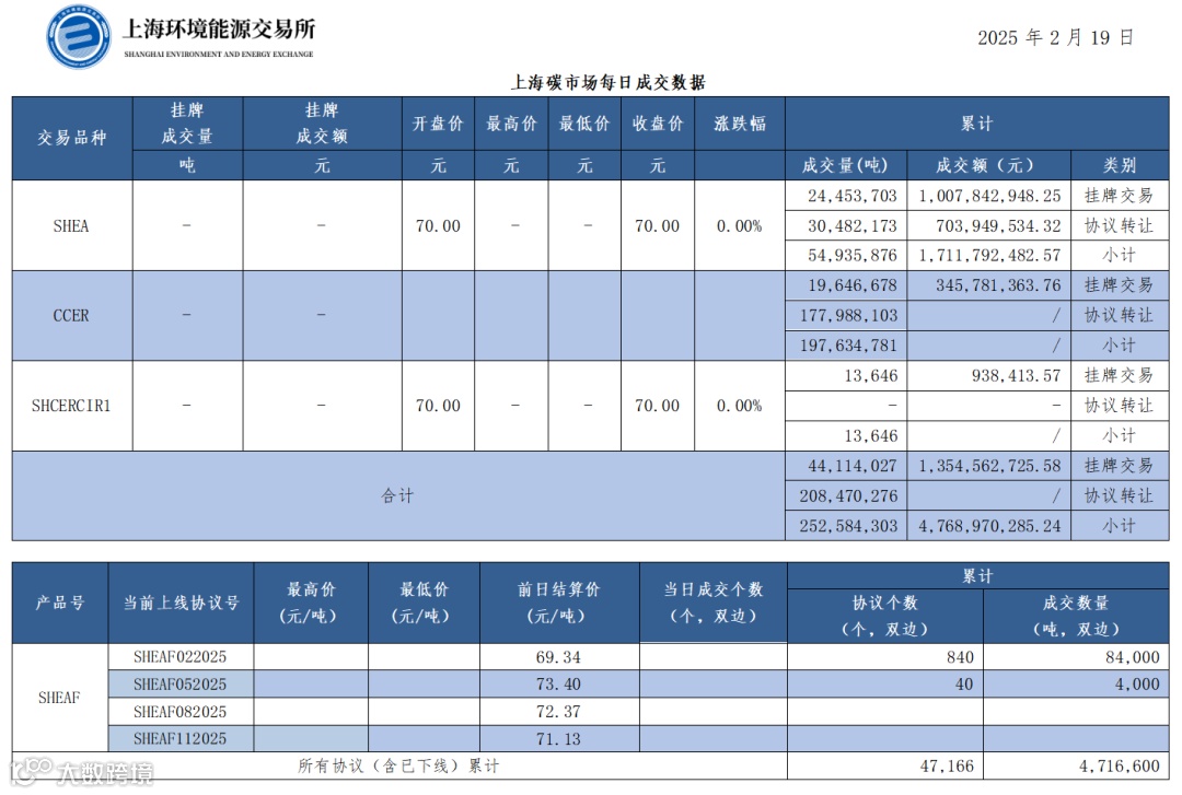 【上海碳市场行情】上海碳市场每日成交数据20250219