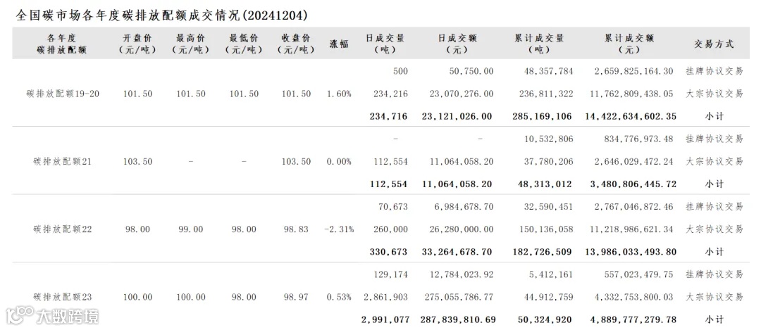 2024年1月1日至12月4日,全国碳市场碳排放配额成交量124,910,936吨,成交额11,860,101,302.37元。