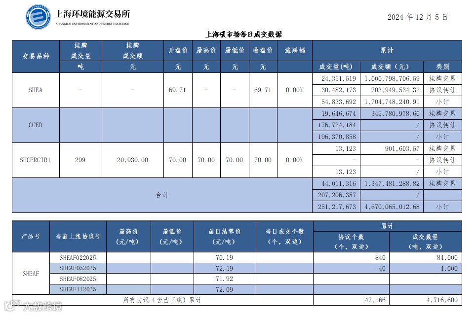 碳市场SHCERCIR1挂牌成交299吨,成交额20,930.00元,收盘价70.00元/吨,与上一交易日收盘价持平。CCER协议转让成交137,699吨。