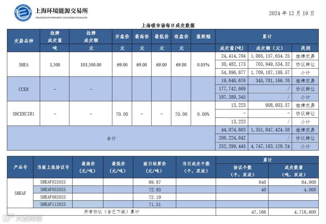 【上海碳市场行情】上海碳市场每日成交数据20241219