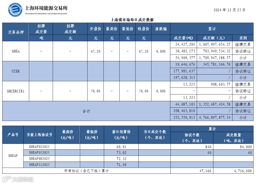【上海碳市场行情】上海碳市场每日成交数据20241223