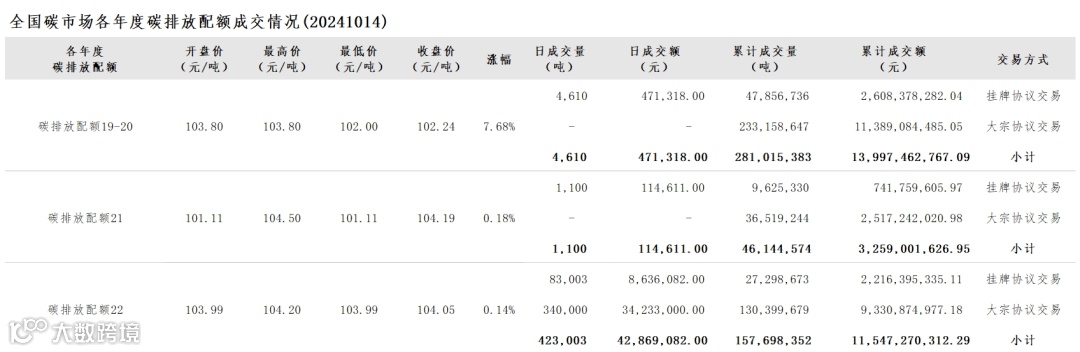 2024年1月1日至10月14日,全国碳市场碳排放配额成交量43,235,698吨,成交额3,884,584,187.05元。