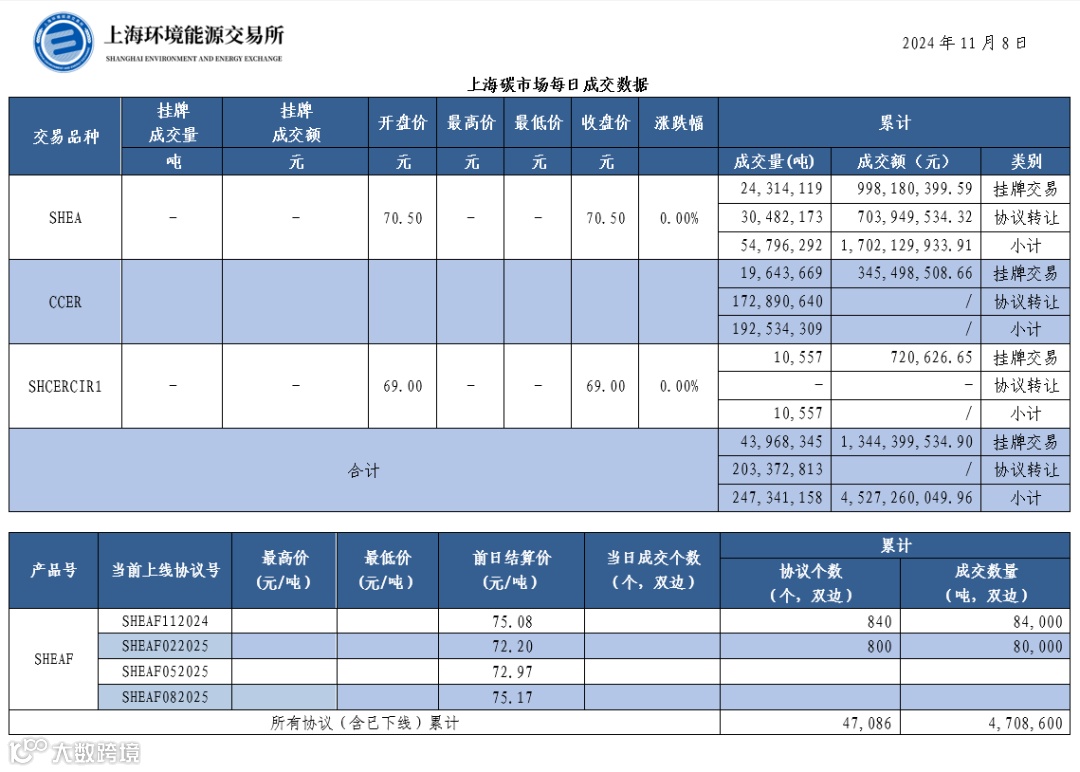 截止今日,上海碳市场所有现货品种累计成交量247,341,158吨,累计成交金额4,527,260,049.96元。其中,配额累计成交54,796,292吨,成交金额1,702,129,933.91元;CCER累计成交192,534,309吨;SHCERCIR1累计成交10,557吨。上海碳配额远期产品累计成交数量4,708,600吨。