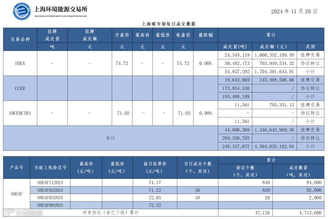 截止今日,上海碳市场所有现货品种累计成交量248,337,072吨,累计成交金额4,564,033,182.94元。其中,配额累计成交54,827,292吨,成交金额1,704,301,643.91元;CCER累计成交193,498,199吨;SHCERCIR1累计成交11,581吨。上海碳配额远期产品累计成交数量4,712,600吨。