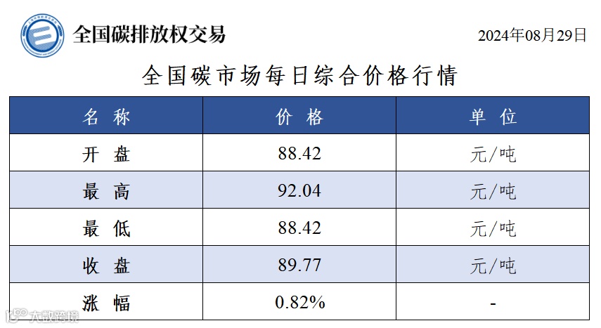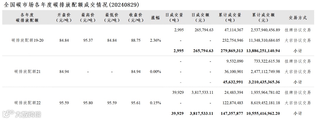 【行情】全国碳市场每日综合价格行情及成交信息20240829