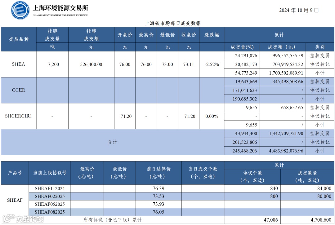 碳市场SHEA挂牌交易成交7,200吨,成交额526,400.00元,收盘价73.11元/吨,较上一交易日收盘价下跌2.52%;CCER协议转让成交416吨。