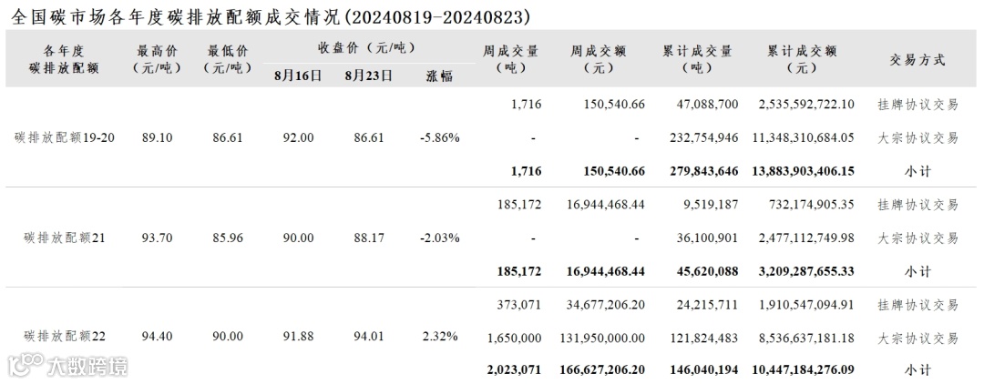 2024年1月1日至8月23日,全国碳市场碳排放配额成交量29,881,317吨,成交额2,621,224,818.29元。
