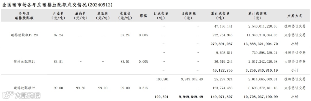 【行情】全国碳市场每日综合价格行情及成交信息20240912