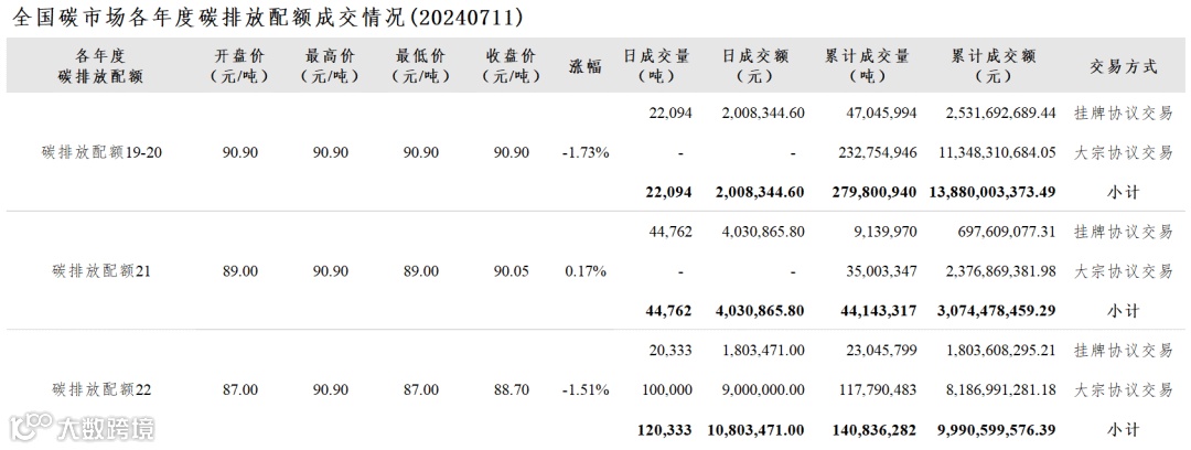 【行情】全国碳市场每日综合价格行情及成交信息20240711