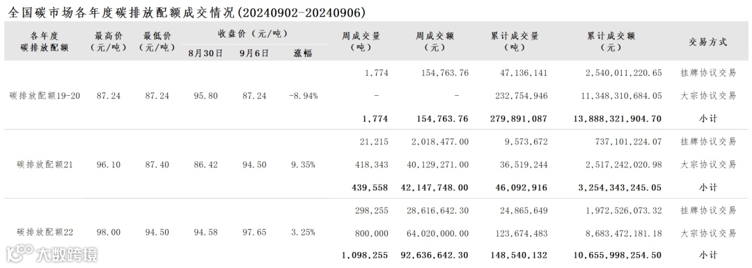 2024年1月1日至9月6日,全国碳市场碳排放配额成交量32,901,524吨,成交额2,879,512,884.97元。