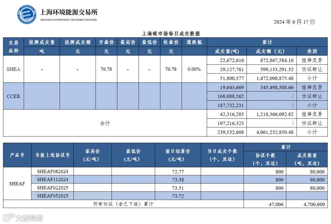 截止今日,上海碳市场所有现货品种累计成交量239,532,608吨,累计成交金额4,061,232,850.48元。其中,配额累计成交51,800,377吨,成交金额1,472,000,875.48元;CCER累计成交187,732,231吨。上海碳配额远期产品累计成交数量4,700,600吨。