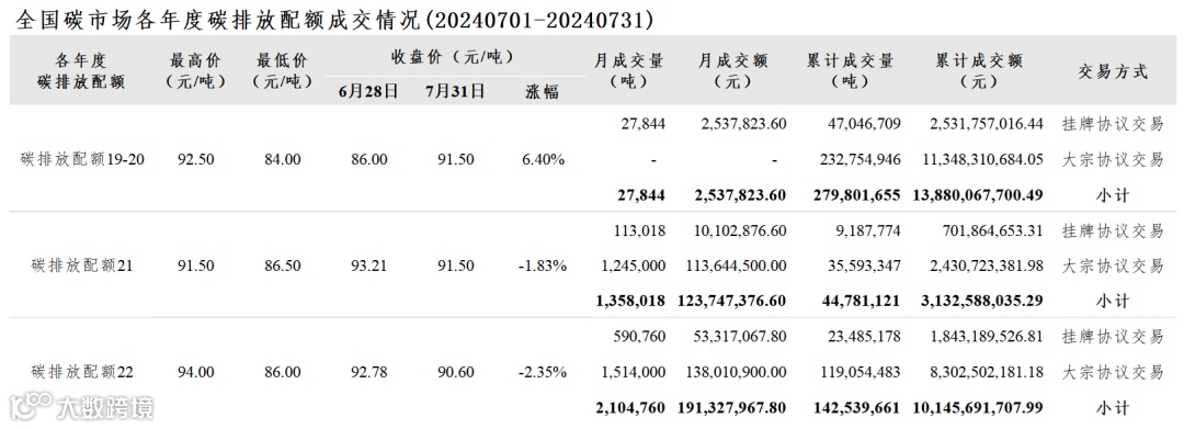 【月报】全国碳市场每月综合价格行情及成交信息20240701-20240731