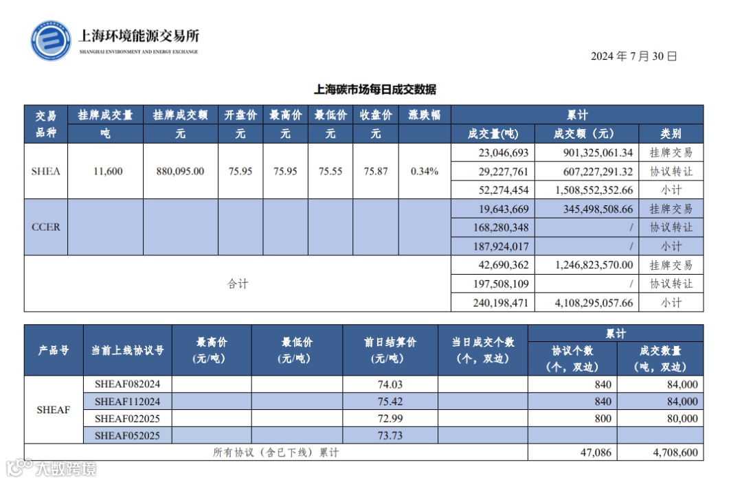 今日上海碳市场SHEA挂牌交易成交11,600吨,成交额880,095.00元,收盘价75.87元/吨,较上一交易日收盘价上涨0.34%。