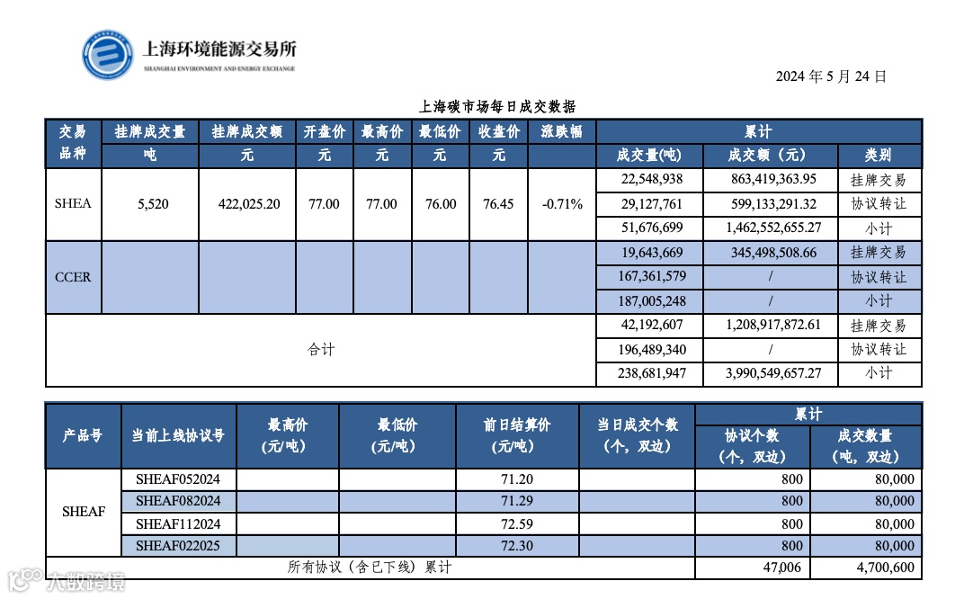碳市场SHEA挂牌交易成交5,520吨,成交额422,025.20元,收盘价76.45元/吨,较上一交易日收盘价下跌0.71%;CCER协议转让成交215,000吨。