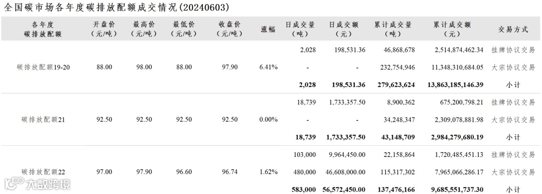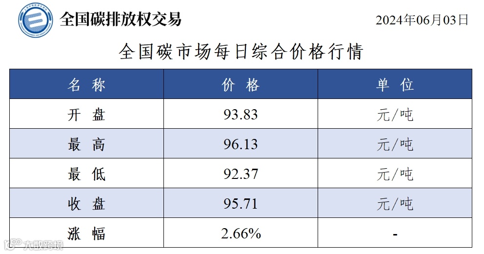 【行情】全国碳市场每日综合价格行情及成交信息20240603