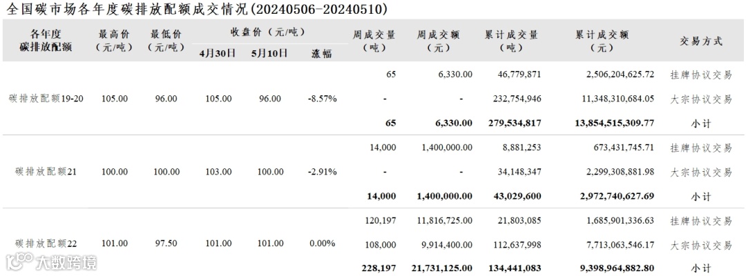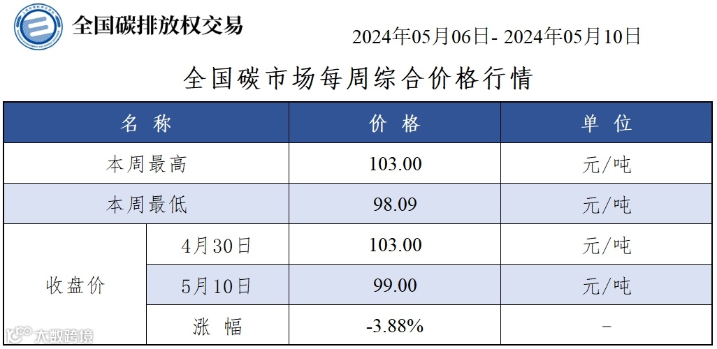 【周报】全国碳市场每周综合价格行情及成交信息20240506-20240510