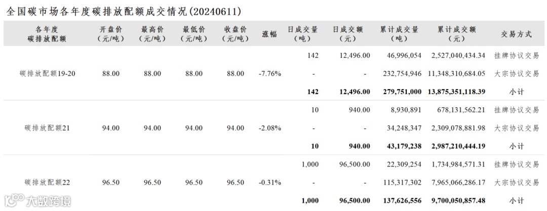 截至今日,全国碳市场碳排放配额累计成交量460,556,794吨,累计成交额26,562,612,420.06元。
