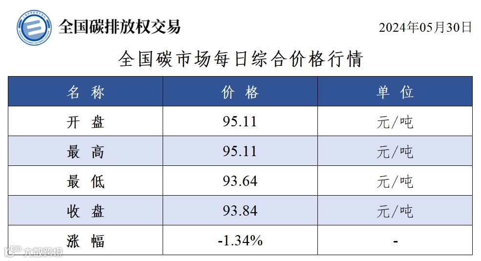 【行情】全国碳市场每日综合价格行情及成交信息20240530