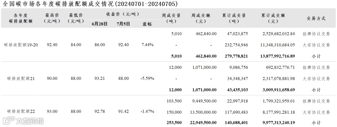 【周报】全国碳市场每周综合价格行情及成交信息20240701-20240705