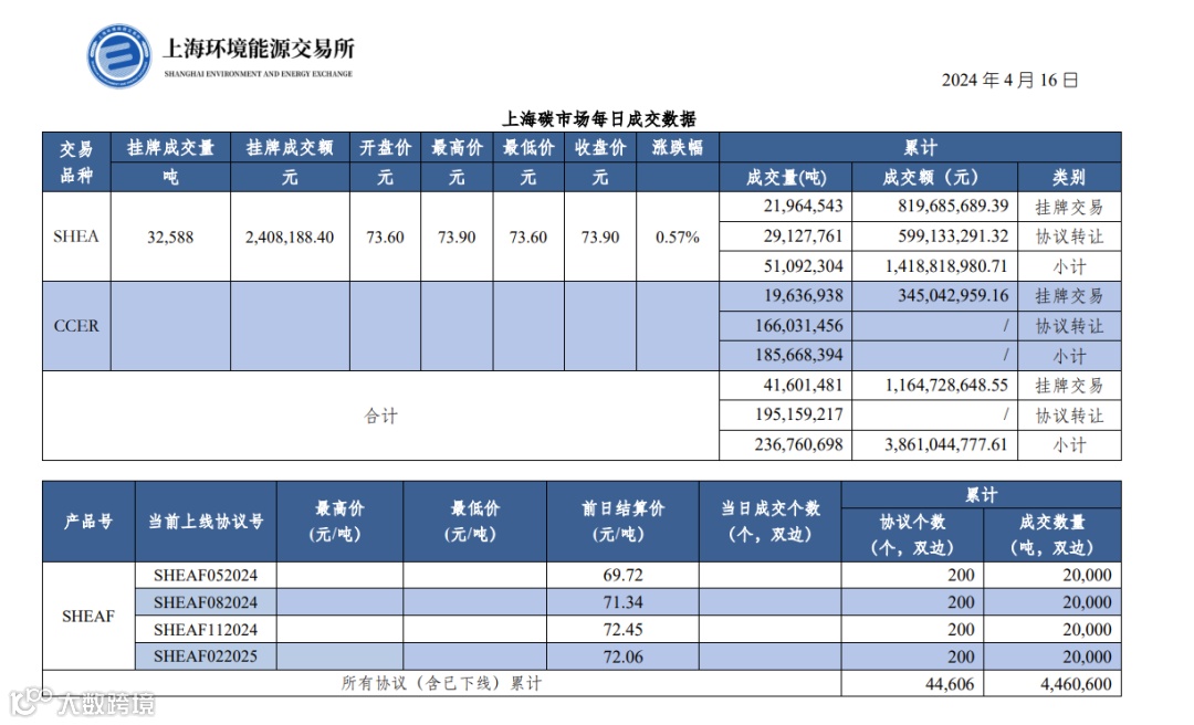 今日上海碳市场 SHEA 挂牌交易成交 32,588 吨,成交额 2,408,188.40 元,收盘价 73.90 元/吨,较上一交易日收盘价 上涨 0.57%;CCER 协议转让成交 28,100 吨。