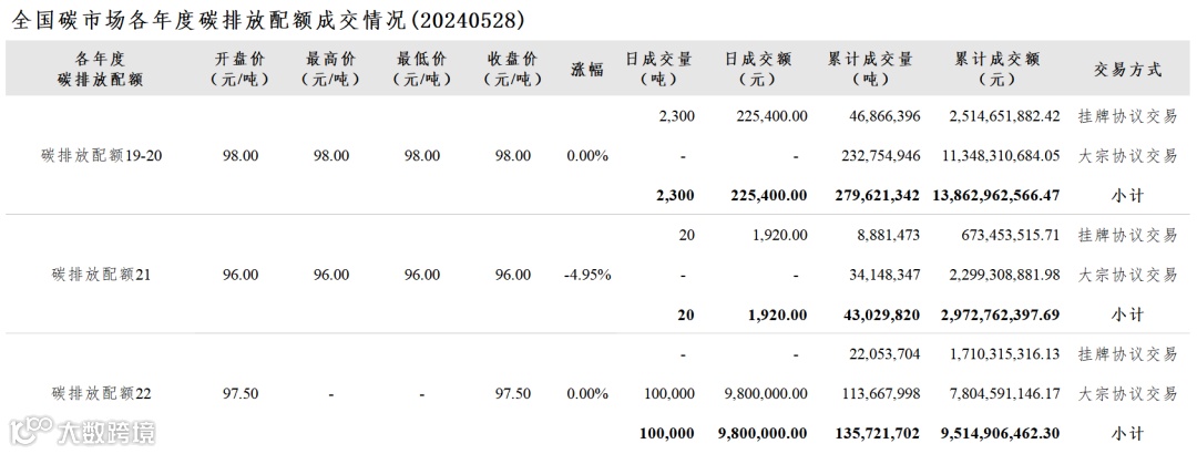 今日全国碳排放配额总成交量102,320吨,总成交额10,027,320.00元。