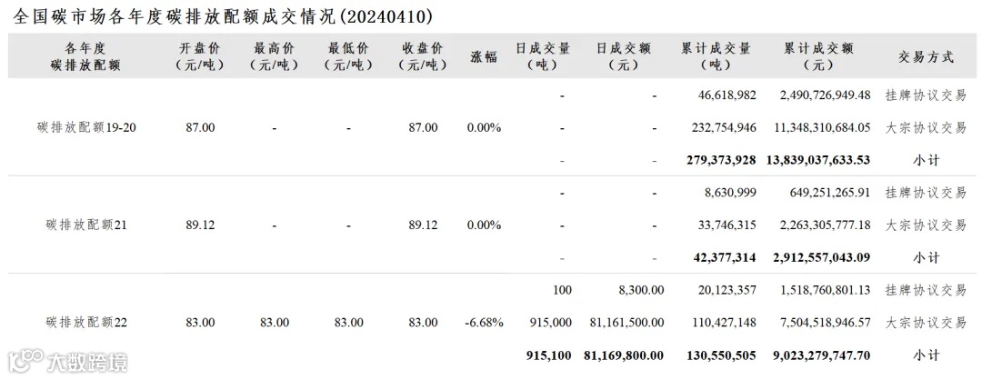【行情】全国碳市场每日综合价格行情及成交信息20240410