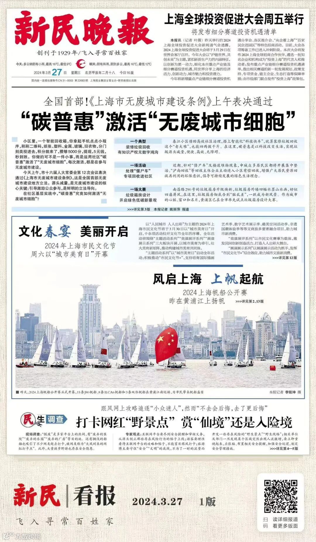 2024年3月27日出版的新民晚报头版刊登《全国首部!〈上海市无废城市建设条例〉上午表决通过——社区“碳普惠”激活“无废城市细胞”》的报道。