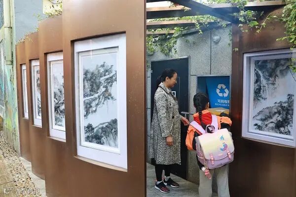 百年南昌路,要看街区新景观,就来南昌路290号。这里,垃圾箱房升级焕新,马路边上,四幅水墨山水画,好似四扇屏风,正是垃圾箱房外墙;箱房里,感应式四分类投放口,整洁实用。在这里,垃圾箱房彻底告别“脏乱差”,一跃成为新风景。