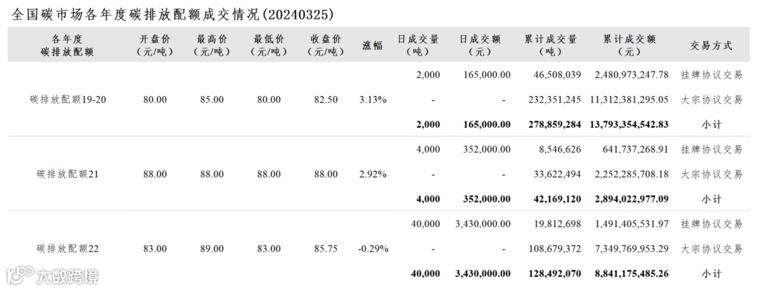 【行情】全国碳市场每日综合价格行情及成交信息20240325