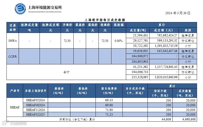 截止今日,上海碳市场所有现货品种累计成交量235,328,095吨,累计成交金额3,820,015,963.99元。其中,配额累计成交50,722,192吨,成交金额1,391,815,715.59元;CCER累计成交184,605,903吨。上海碳配额远期产品累计成交数量4,460,600吨。