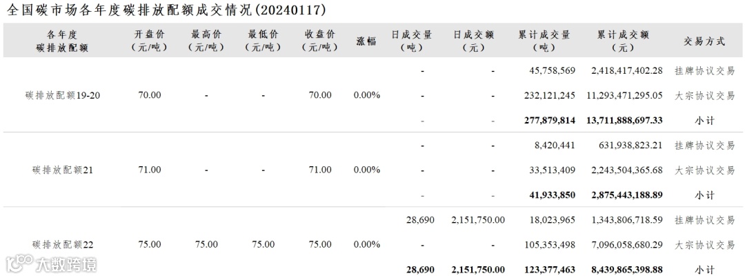【行情】全国碳市场每日综合价格行情及成交信息20240117