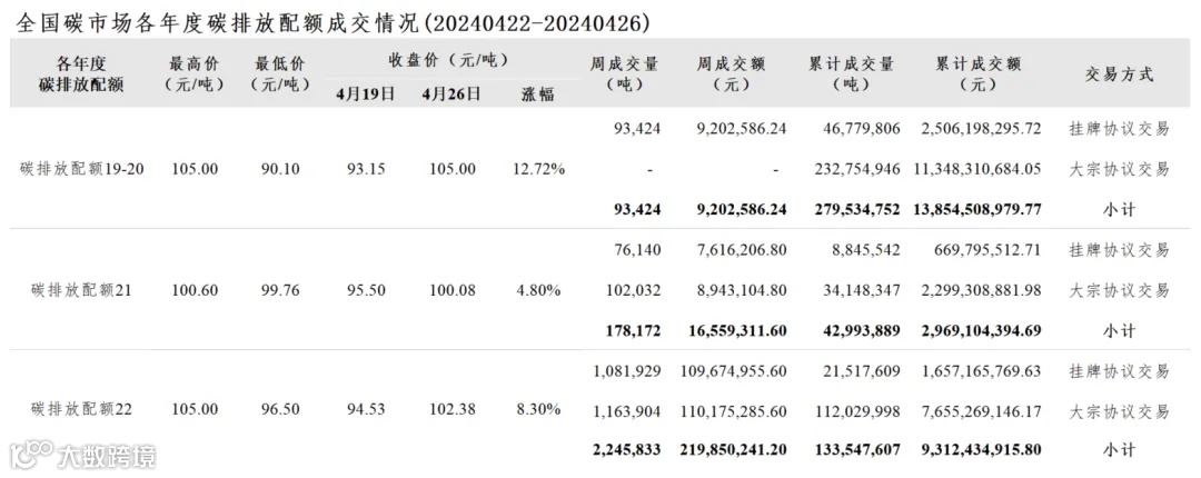 【周报】全国碳市场每周综合价格行情及成交信息20240422-20240426