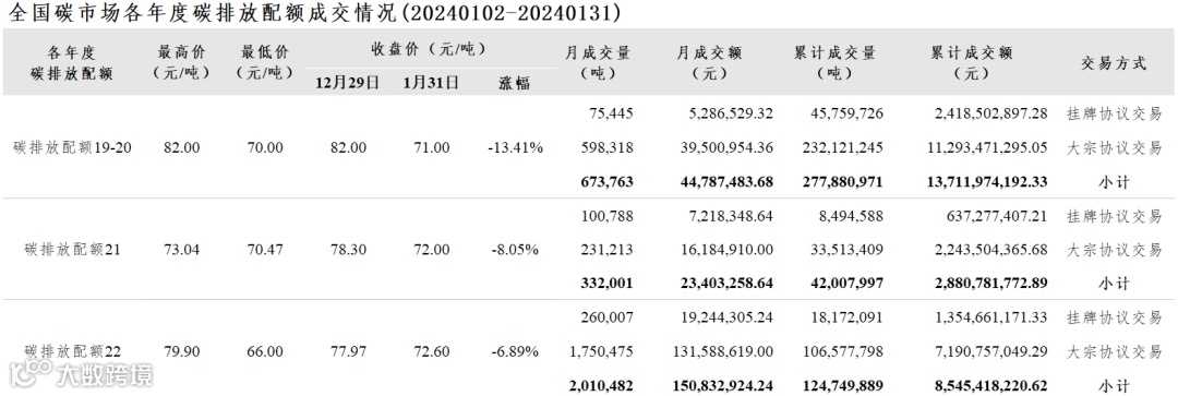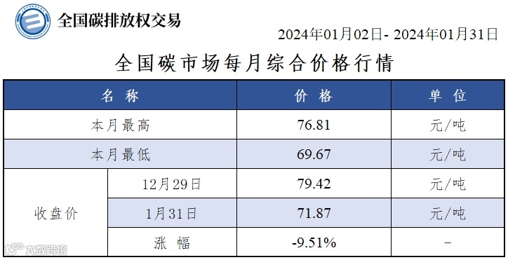 【月报】全国碳市场每月综合价格行情及成交信息20240102-20240131