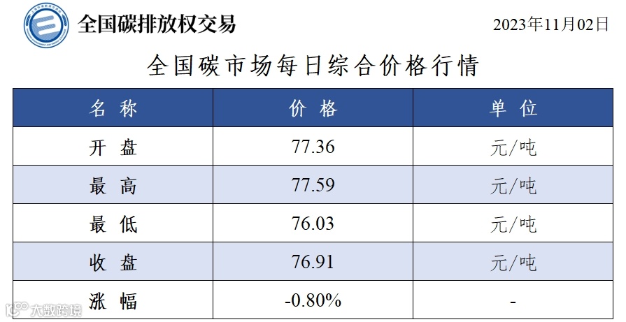 【行情】全国碳市场每日综合价格行情及成交信息20231102