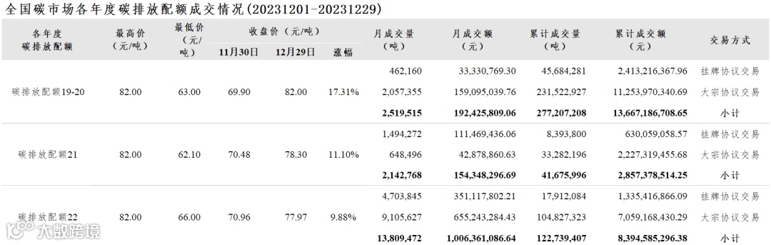 【月报】全国碳市场每月综合价格行情及成交信息20231201-20231229