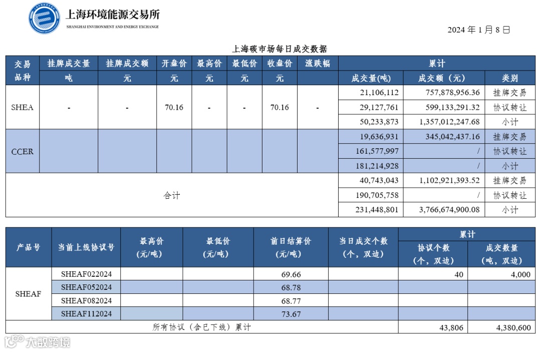 截止今日,上海碳市场所有现货品种累计成交量231,448,801吨,累计成交金额3,766,674,900.08元。其中,配额累计成交50,233,873吨,成交金额1,357,012,247.68元;CCER累计成交181,214,928吨。上海碳配额远期产品累计成交数量4,380,600吨。