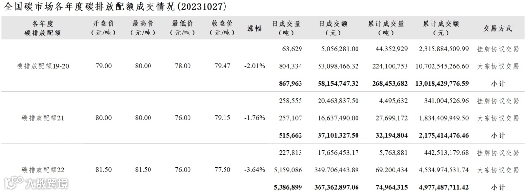【行情】全国碳市场每日综合价格行情及成交信息20231027
