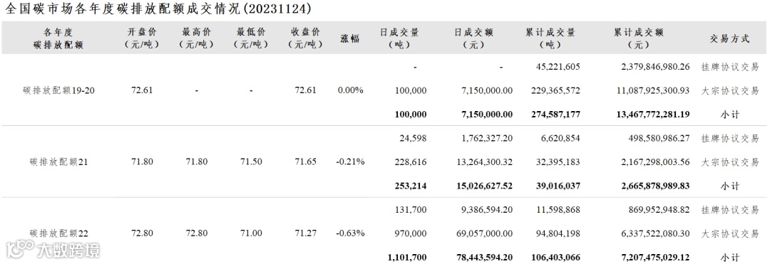 【行情】全国碳市场每日综合价格行情及成交信息20231124