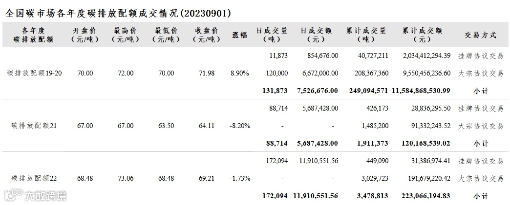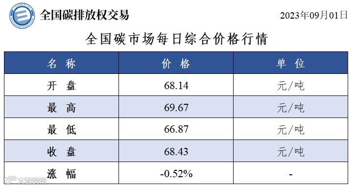 【行情】全国碳市场每日综合价格行情及成交信息20230901